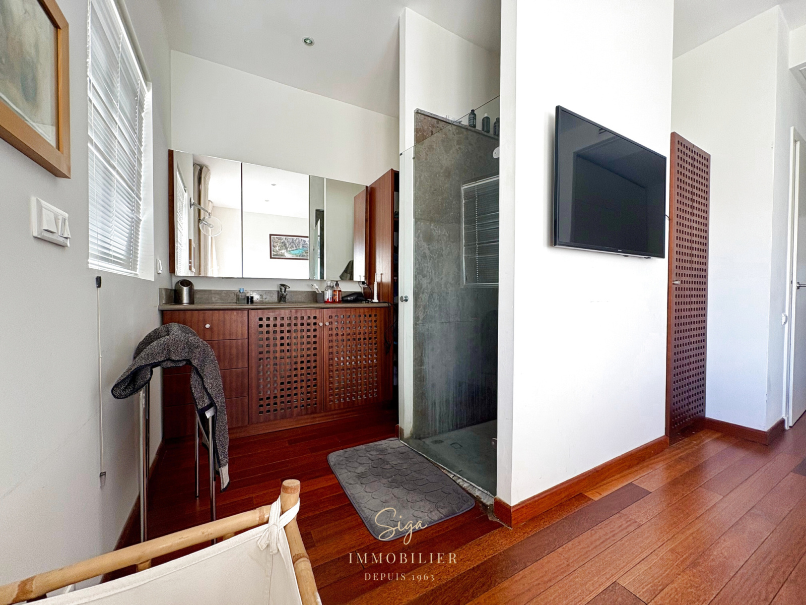 Cuisine ouverte et équipée, suite principale avec dressing et salle d’eau privative, seconde chambre avec salle de bains attenante, buanderie équipée et toilettes indépendantes.