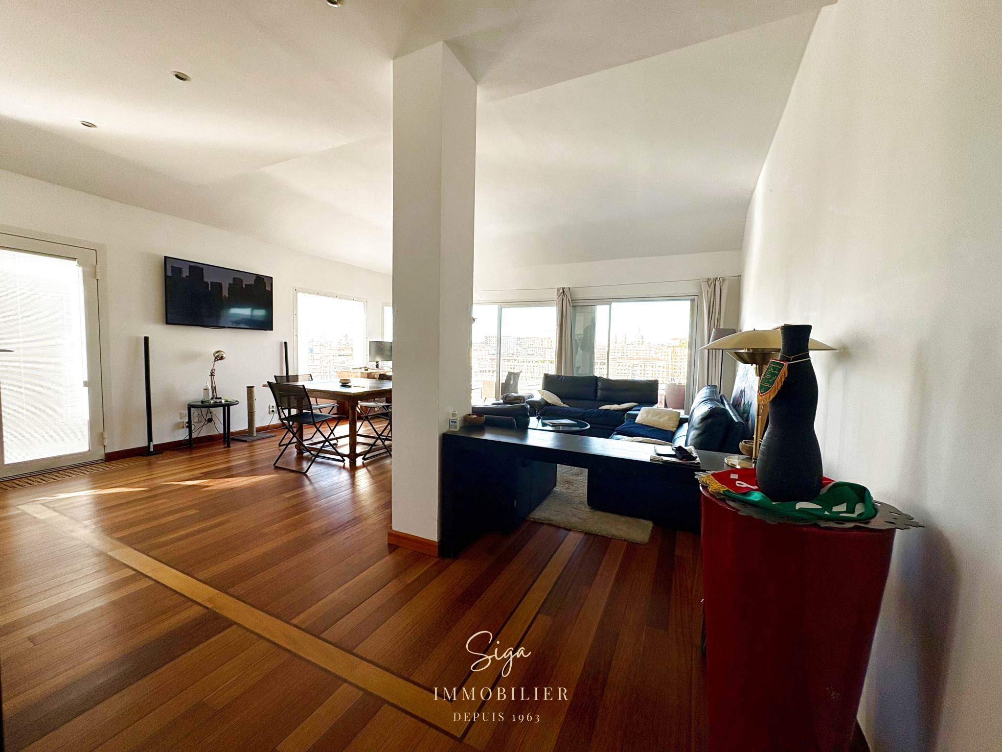 Pièce de vie lumineuse prolongée par une terrasse périphérique d’environ 80 m² offrant un panorama à 360° sur la mer, le port, le Mucem, la Cathédrale de la Major et la Basilique Notre‑Dame de la Garde.