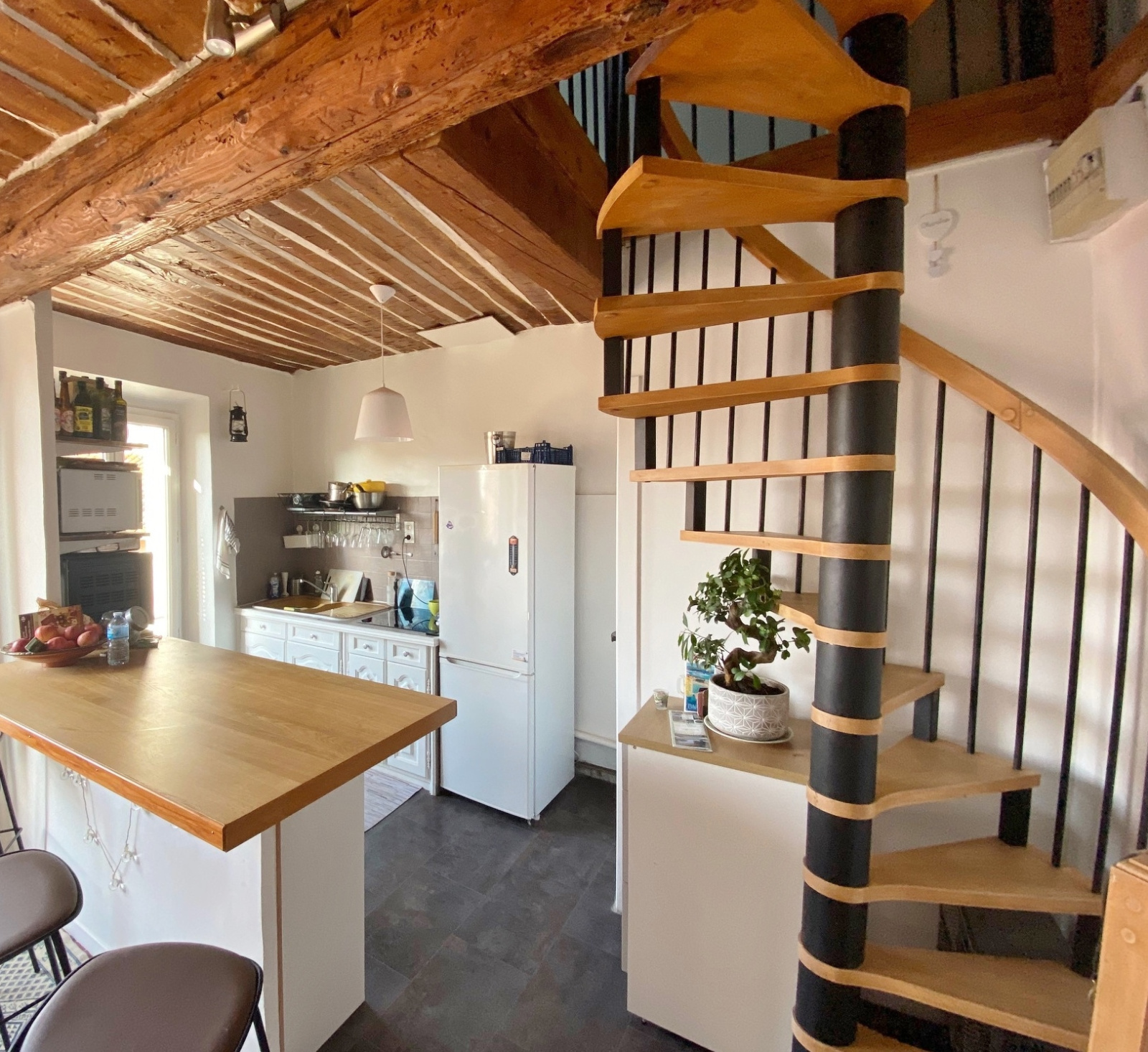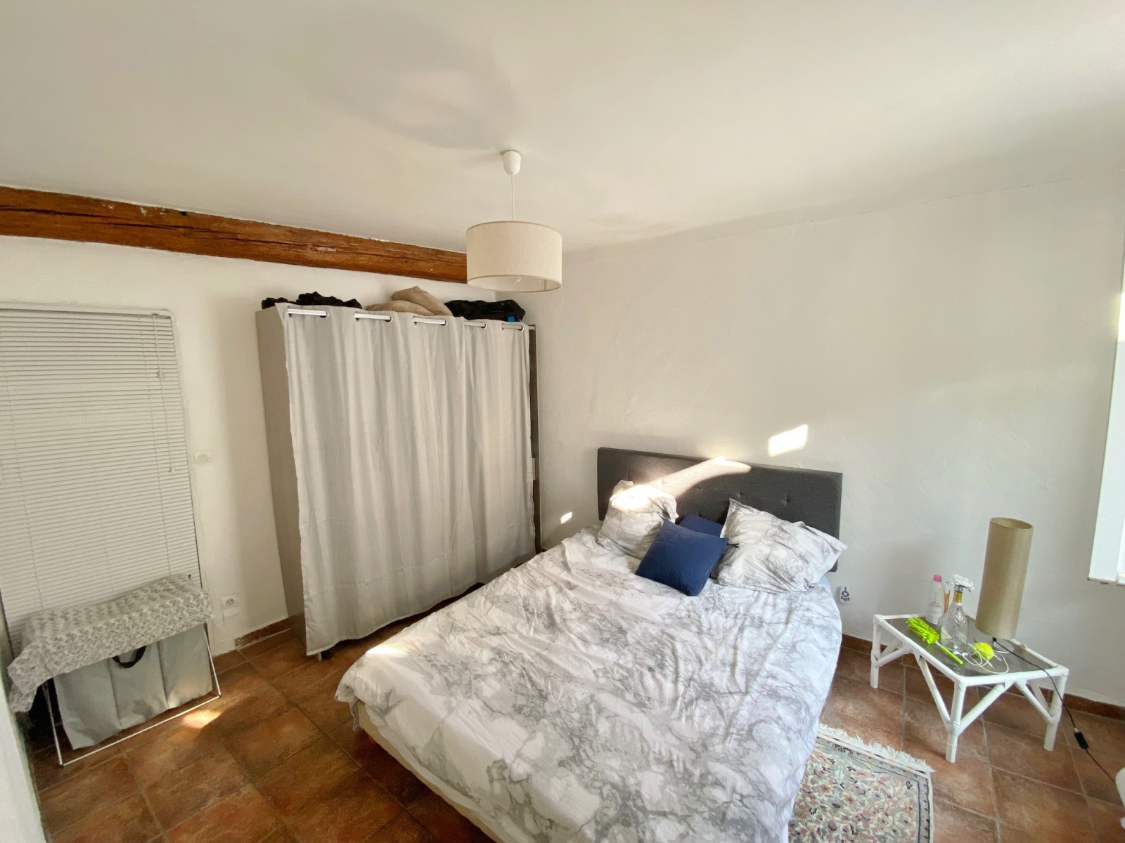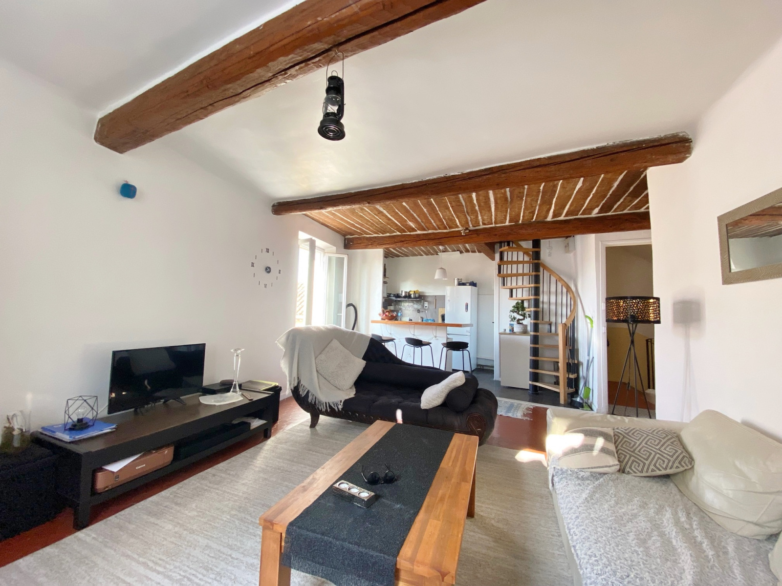 Il offre un séjour lumineux avec de belles tomettes au sol, une cuisine ouverte une chambre et une salle de bain.