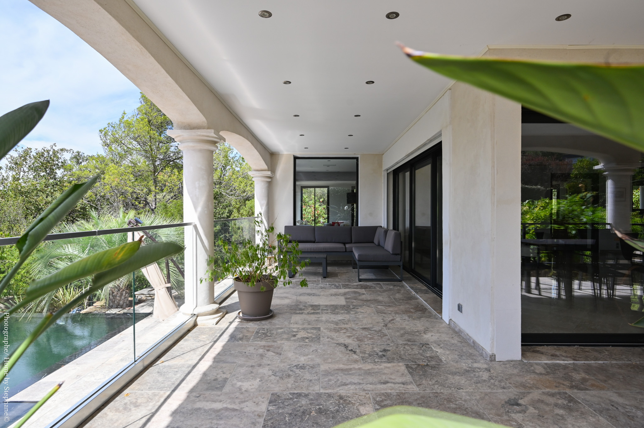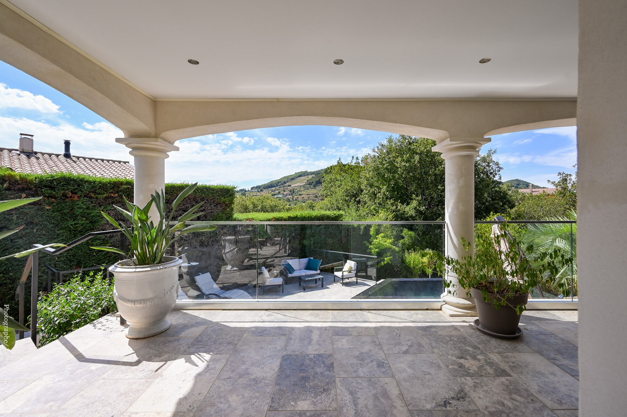 La terrasse, idéale pour vos moments de détente, surplombe une somptueuse piscine à débordement avec une vue dégagée sur la campagne environnante.