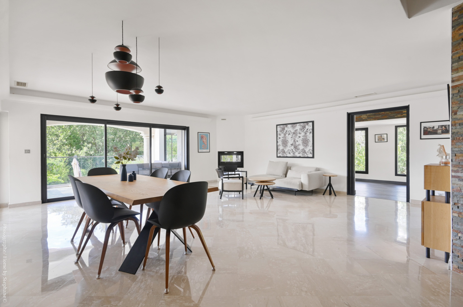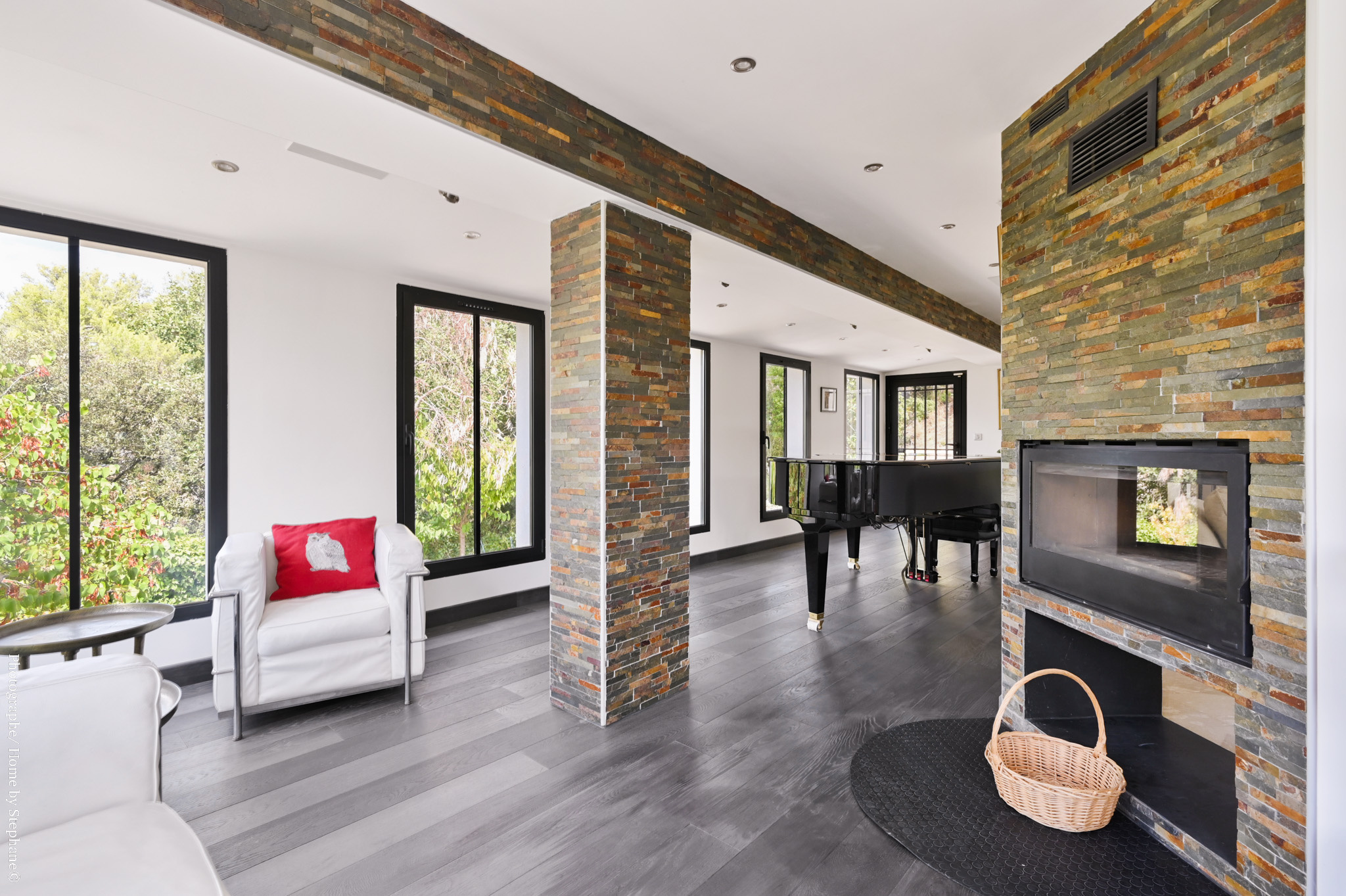 Elle se compose d’un espace principal lumineux avec salon, cuisine, et un second salon avec une cheminée à insert traversant, offrant un cadre chaleureux et convivial.