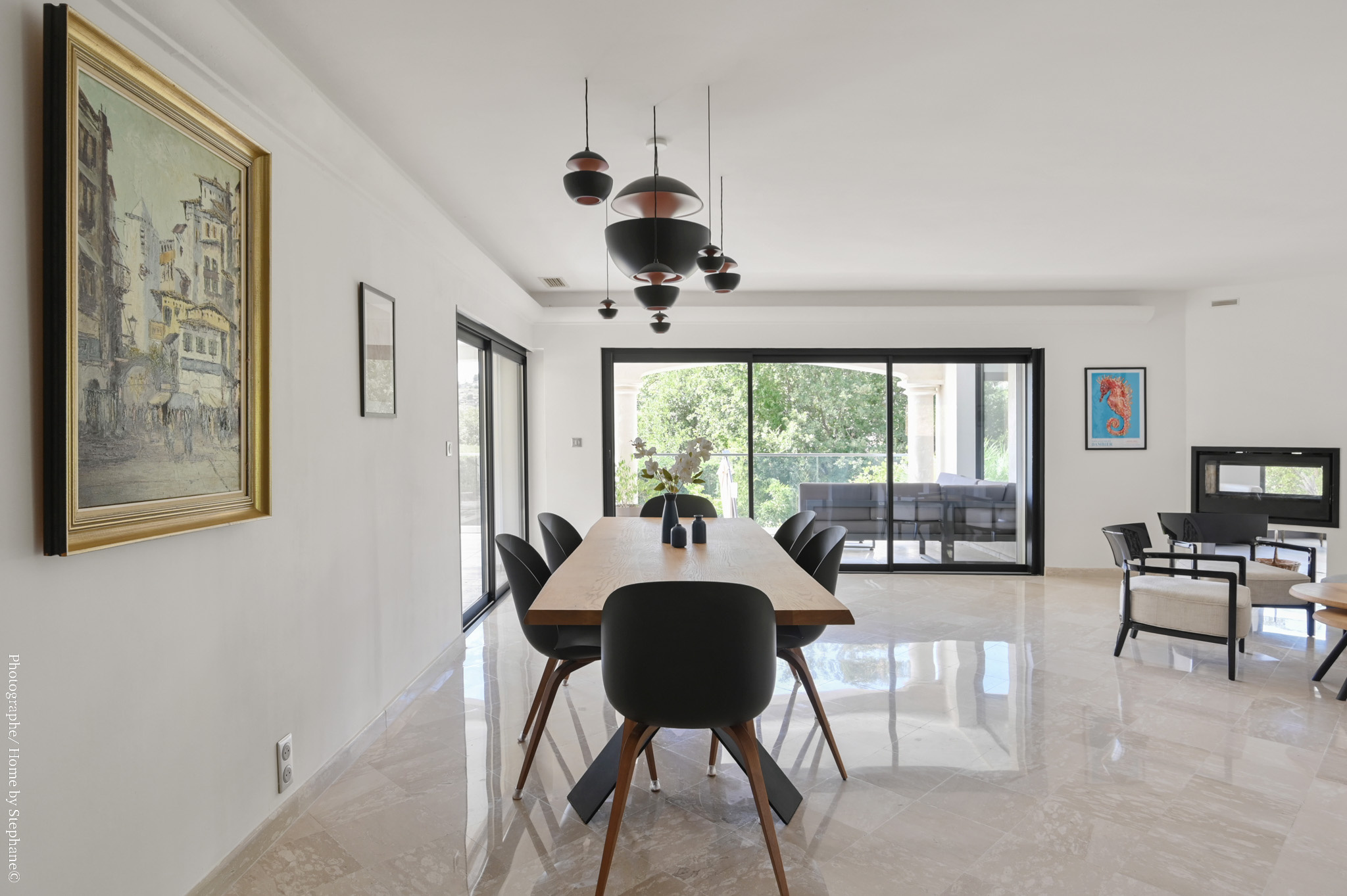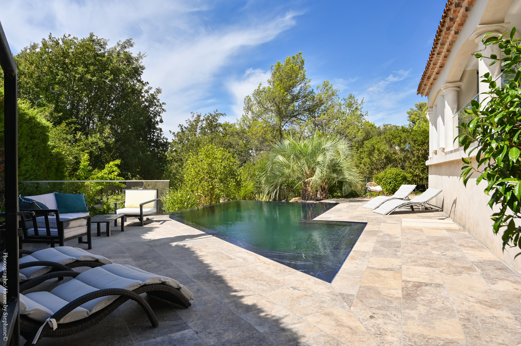 La terrasse, idéale pour vos moments de détente, surplombe une somptueuse piscine à débordement avec une vue dégagée sur la campagne environnante.