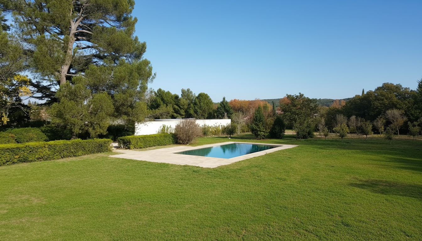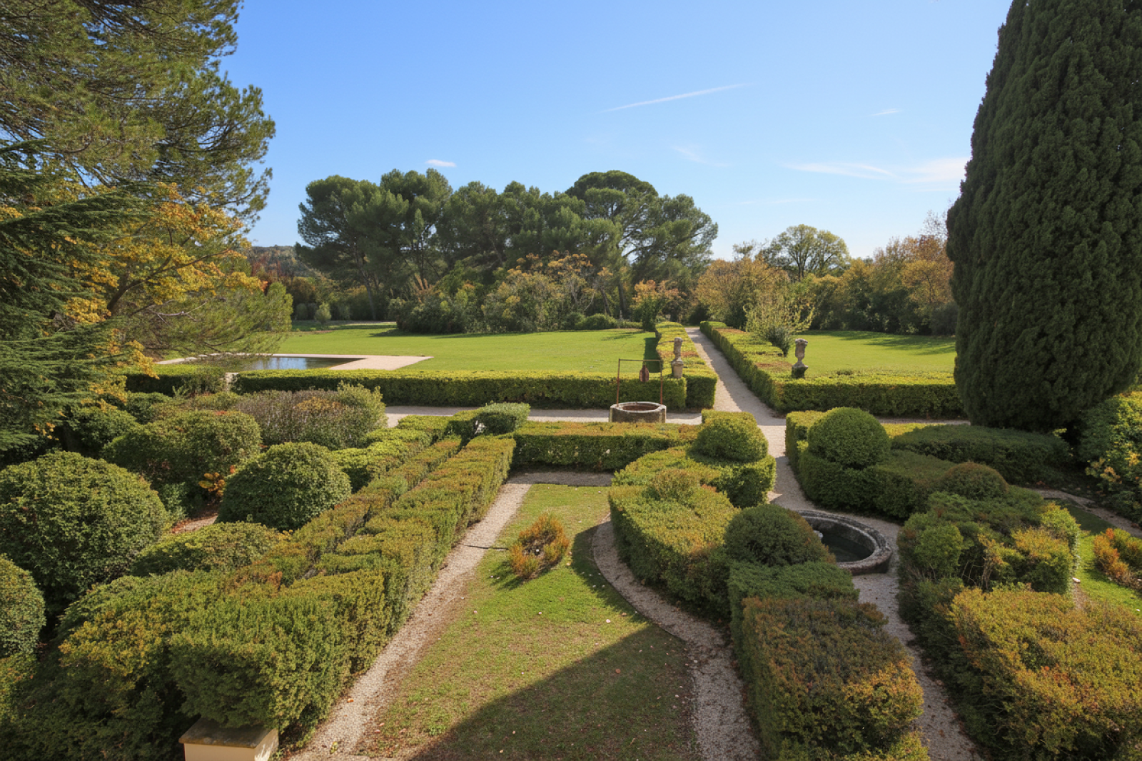 Les jardins à la française, dessinés avec une précision remarquable, confèrent à la propriété une atmosphère de sérénité absolue. Une cour intérieure pavée de calade, agrémentée d’un bassin, crée un lien harmonieux entre la Bastide et une élégante dépendance de 150 m², idéale pour un usage professionnel haut de gamme ou une maison d’amis.
